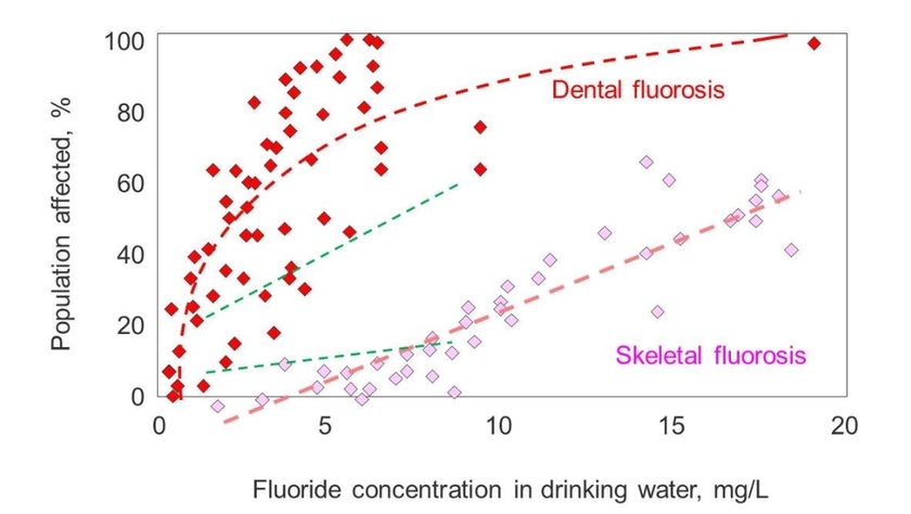 Dose-response assessment: In this step, the relationship between the dose of the contaminant and the risk of a subsequent health effect is characterised. For arsenic and fluoride, dose-response assessments are based on the relationships between the contaminant concentration in drinking water (and food) and the incidence of a particular health effect. This step requires measured data. Health effects need to be identified and characterised by health experts and related to the exposure. An example is given in Figure 3.2. Fewtrell et al. (2006) examined the dose-response relationships from 12 publications on dental fluorosis and 4 publications on skeletal fluorosis. They concluded that more data would be required and that it would be important to include nutritional status and fluoride sources in addition to drinking water.
