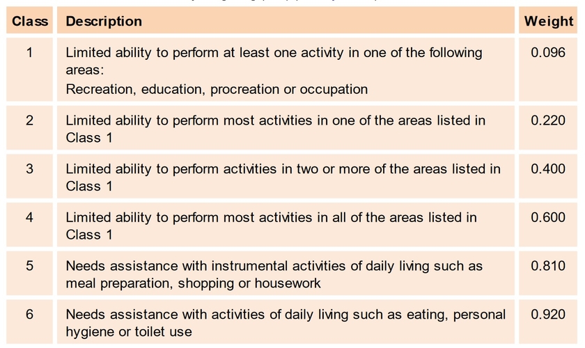 One DALY can be thought of as one year of healthy life lost, and the overall disease burden can be thought of as a measure of the gap between current health status and ideal health status, where the individual lives to old age free from disease and disability. Fewtrell et al. (2005, 2006) assume a life expectancy of 80 years. The health burden (expressed in DALYs) is the sum of mortality (years of life lost, YLL, and years of life with disability, YLD). Disability levels are weighted (see Table 3.4). The weighting correlates to the degree of disability (WHO, 2014). DALY = YLL + YLD where YLL = N x L N: Number of deaths L: Standard life expectancy at age of death in years and YLD = P x DW P: Number of prevalent cases DW: Disability weighting.