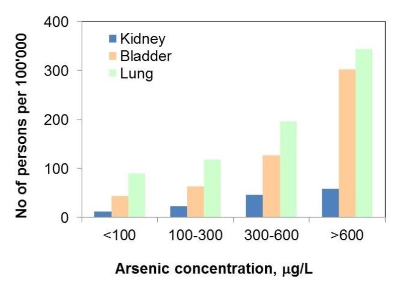 Also shown in Figure 3.2 are the results of a study in Jilin province in China (Bo et al., 2003). The dose-response curves are encouragingly similar. Nevertheless, the nature of the relationship between dose and response remains contentious, and there are calls for more biologically-based risk assessments (Carlson-Lynch et al., 1994; Kitchin and Conolly, 2010). Great efforts have been made to evaluate the dose-response of arsenic-related diseases. Fewtrell et al. (2005) estimated the risk of developing skin lesions caused by elevated arsenic concentrations in drinking water using data from Bangladesh, Inner Mongolia (China) and West Bengal (India). The evaluation showed that at a drinking-water arsenic concentration of >350 mg/L, the age-adjusted prevalence of skin lesions is around 33%. The evaluation of cancer rates and mortality linked to arsenic exposure has also been the subject of many studies (for example Fig. 3.3) and evaluations (e.g. NRC 1999, 2001, 2014). Dose-response functions have been developed to predict incidence rates from arsenic exposure (usually in drinking water). The functions include available demographic parameters, such as gender and age (e.g. Yu et al., 2003). The determination of dose-response functions for both arsenic and fluoride is very much a field of development. As new data sets become available, the models will certainly be refined. One important factor is nutritional status, as malnutrition increases the likelihood of disease (NRC, 2001 and references therein). Differences in water consumption and diet, and the speciation of the contaminant in foodstuffs, have also been noted as factors that affect dose-response functions.